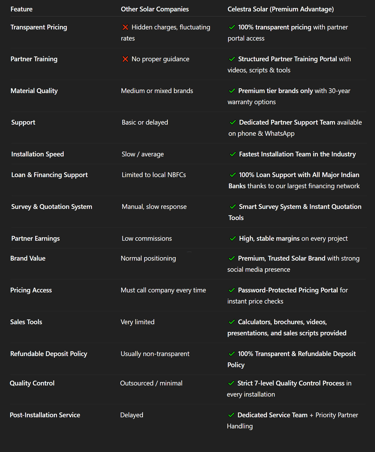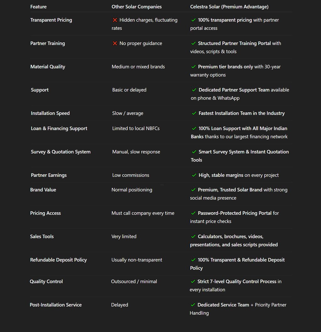 Celestra provides premium installations, transparent pricing, loan support with all major banks, fastest installation in the industry, and a strong brand. This makes it easier for partners to earn.